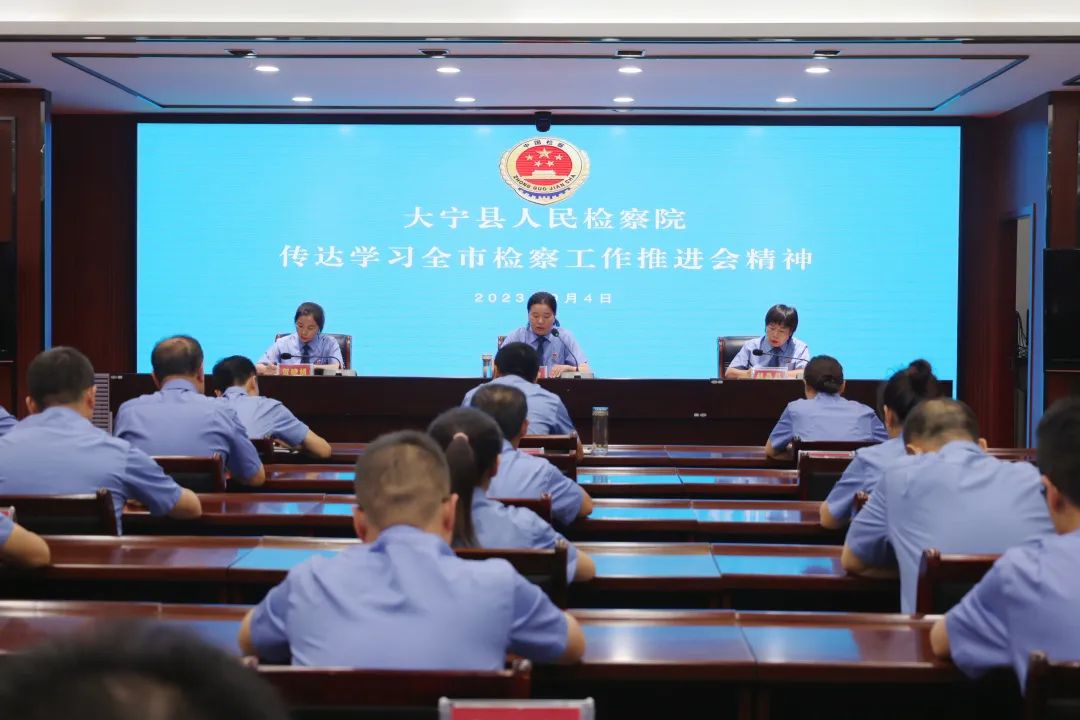 9月4日,大宁县人民检察院召开全体干警会议,传达学习全市检察工作推进会议精神。县人民检察院党组书记、检察长肖玲主持会议并讲话。